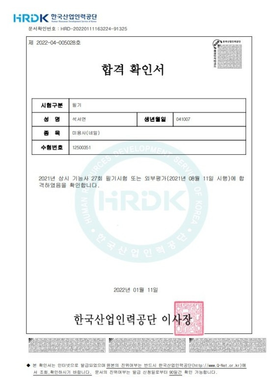 | 미용사(네일) 필기 최유신 합격을 축하드립니다 (0) | 2025.01.13 |