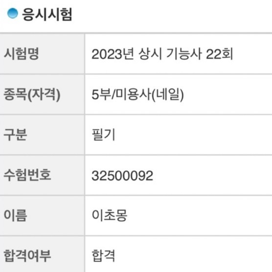 미용사(네일) 필기 이초몽 합격을 축하드립니다