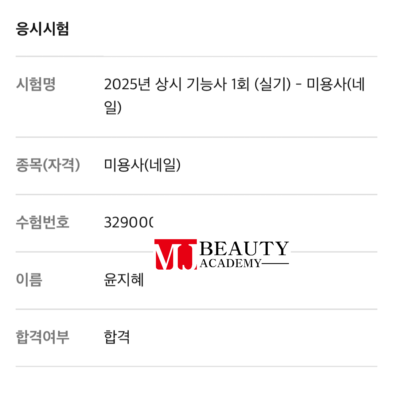| 미용사(네일) 실기 박수아 최종합격을 축하드립니다. (0) | 2025.01.31 |