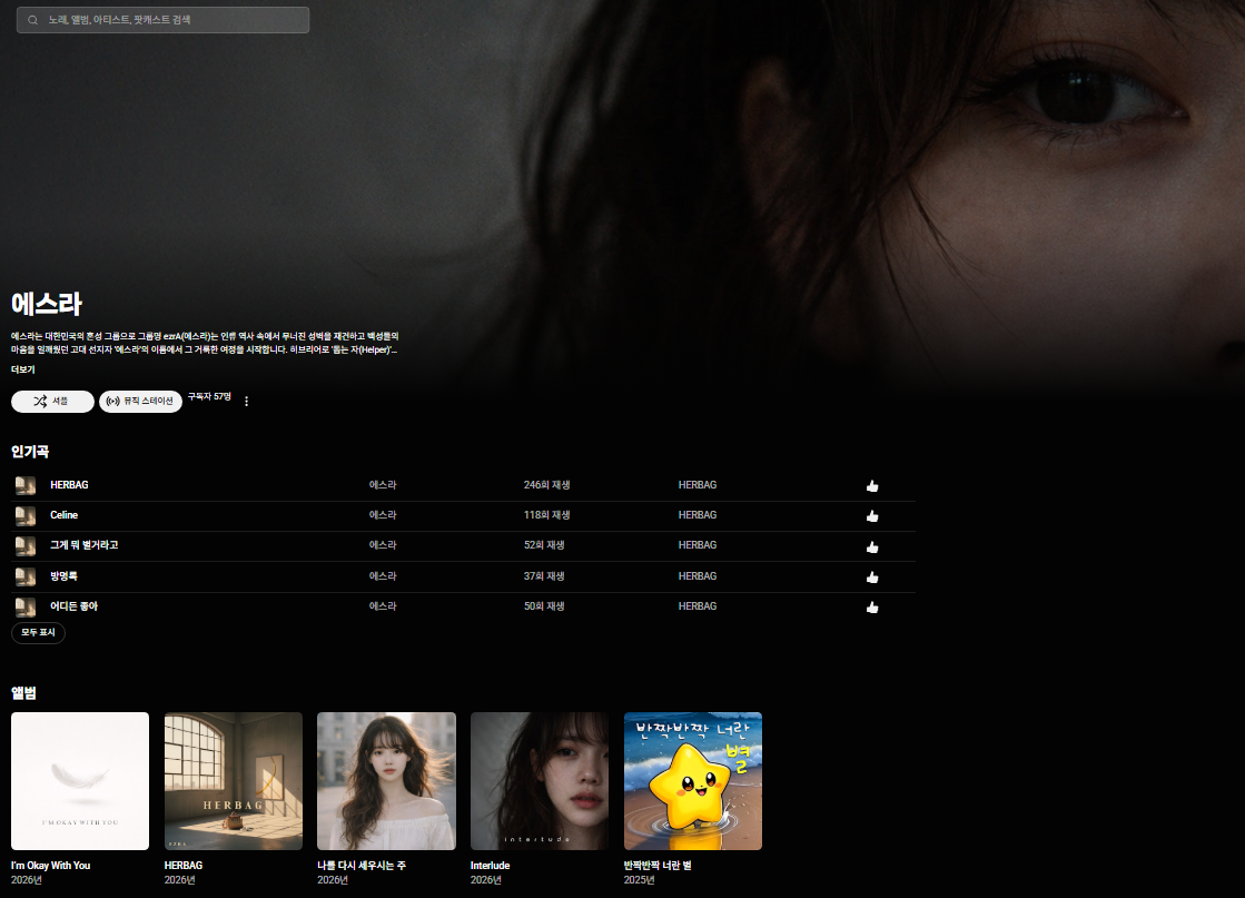 에스라는 대한민국의 혼성 그룹으로그룹명 ezrA(에즈라)는히브리어로 '돕는 자(Helper)'를 의미하는 이 이름은,단순히 음악을 만드는 집단을 넘어 혼란스러운 현대 사회 속에서 방황하는 사람들에게음악이라는 도구로 안식처를 제공하고 올바른 가치를 재건하겠다는 소명을 상징합니다. 멜론 : https://www.melon.com/artist/timeline.htm?artistId=4718199 에즈라음악이 필요한 순간, 멜론www.melon.com FLO : https://www.music-flo.com/detail/artist/413033769/track?sortType=POPULARITY&roleType=ALL 에즈라FLO - 1억 곡을 FLO에서, 플로, 에즈라, CCMm.music-flo.com ..