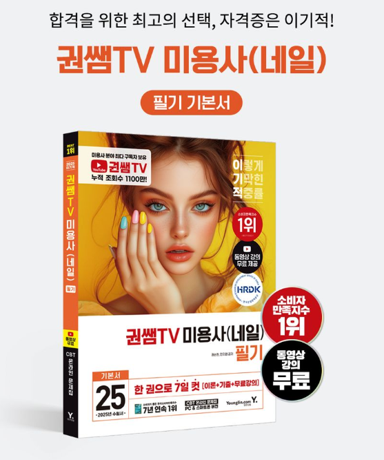 영진출판사와 권순현, 민지영이 함께 만든  이기적의 미용 수험서! 전국 온/오프라인 서점에서 만나요~! 교보문고 : https://product.kyobobook.co.kr/detail/S000216002263 2025 이기적 권쌤TV 미용사(네일) 필기 기본서 | 권순현 - 교보문고2025 이기적 권쌤TV 미용사(네일) 필기 기본서 | ‘2025 이기적 권쌤TV 미용사(네일) 필기 기본서’ 도서가 이기적 영진닷컴에서 출간되었다. 본 도서는 미용사(네일) 필기시험을 준비하는 분들이 효product.kyobobook.co.kr