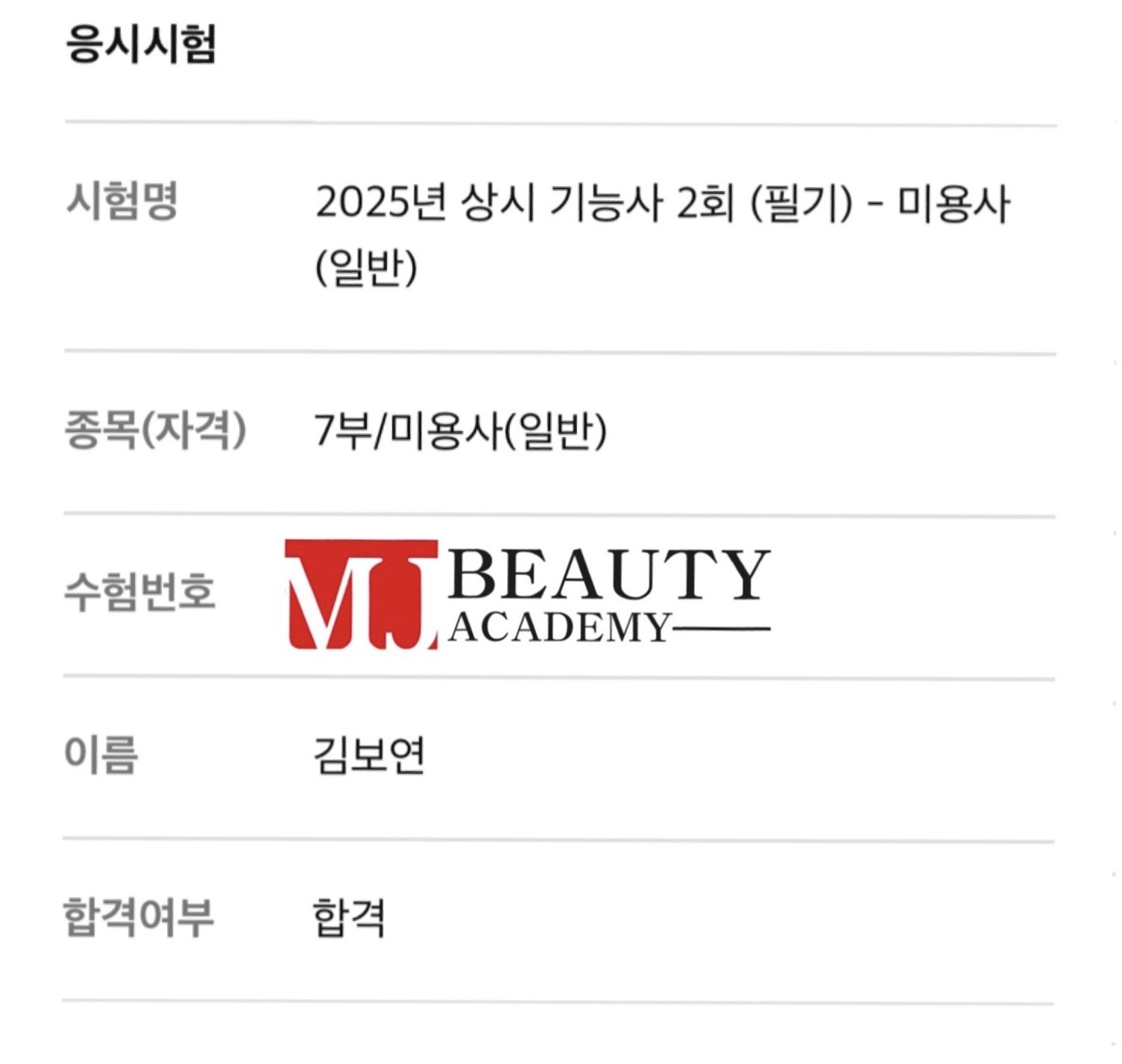 미용사(일반) 필기 김보연 합격을 축하합니다.