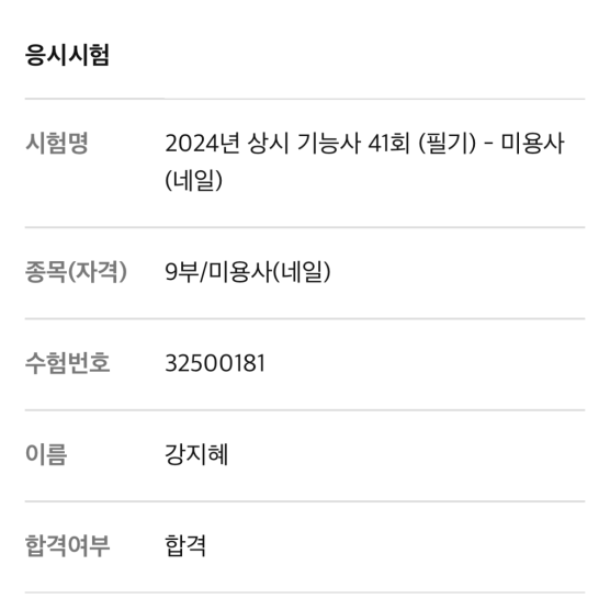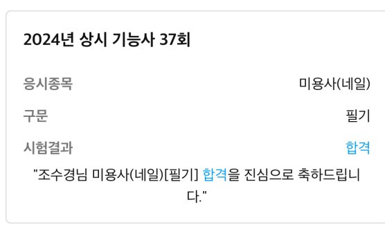 미용사(네일) 필기 조수경 합격을 축하드립니다