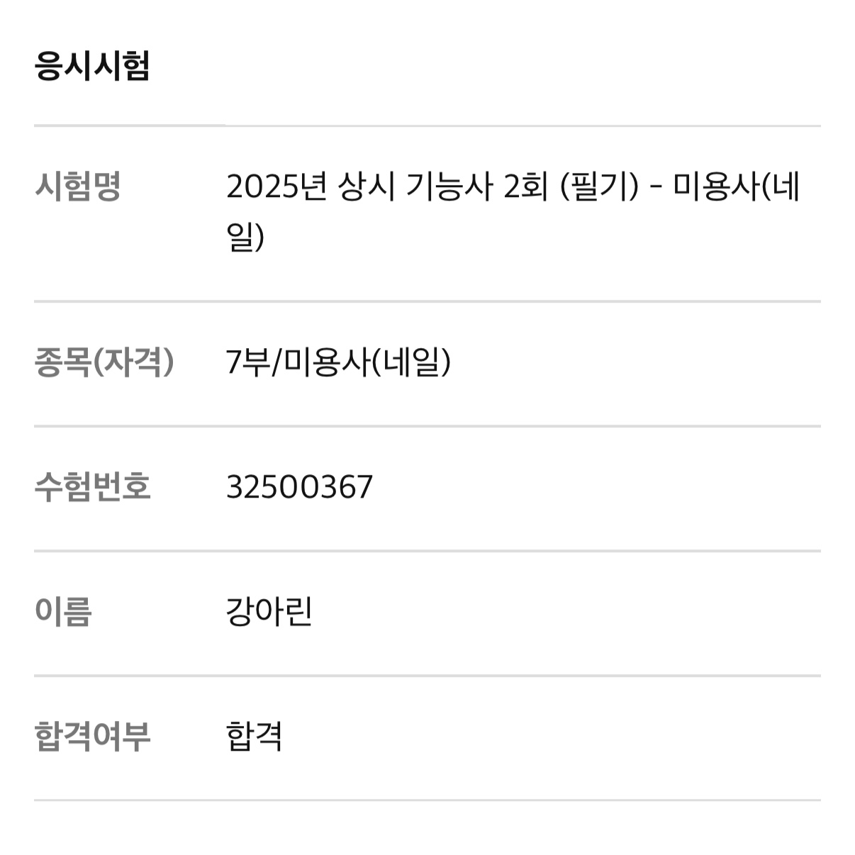 미용사(네일) 필기 강아린 합격을 축하드립니다
