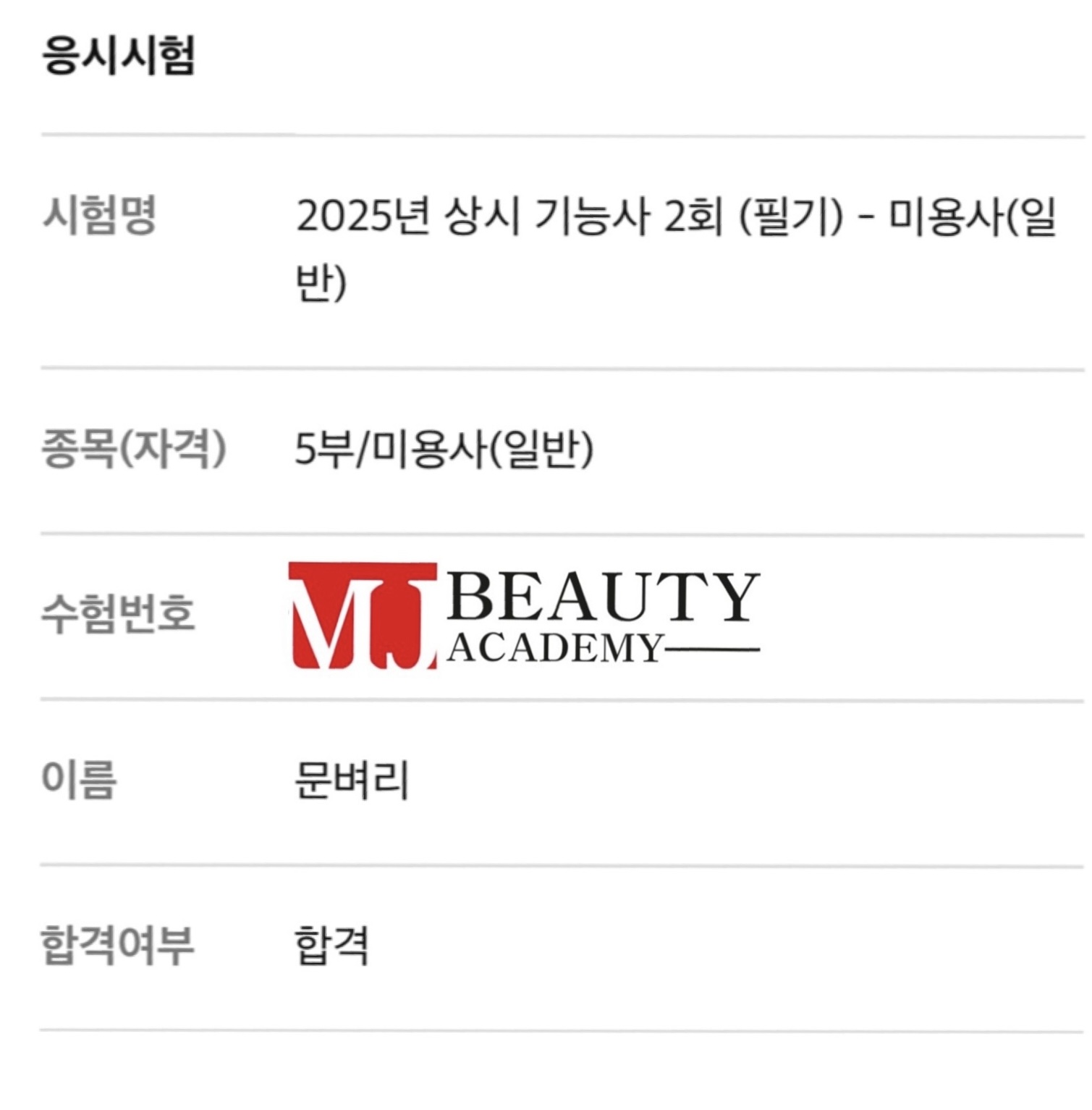 미용사(일반) 필기 문벼리 합격을 축하합니다.