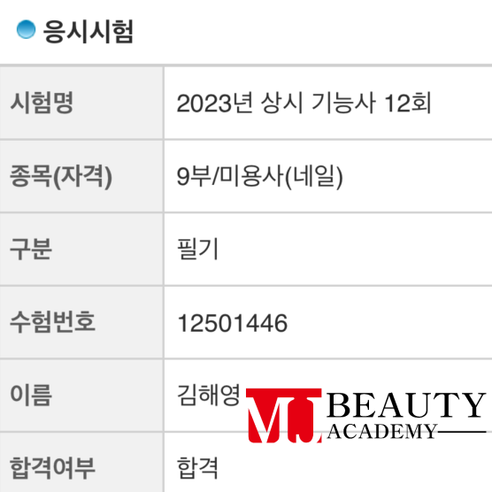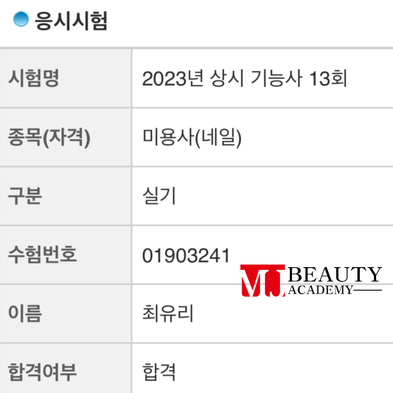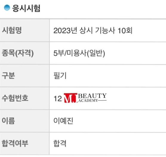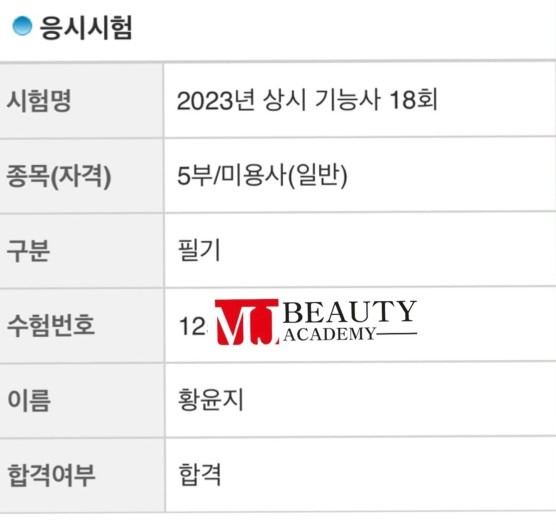 미용사(피부) 유채원 실기 최종합격을 축하드립니다 고득점으로 합격하셨네요^^ 열심히 하신만큼 기쁨소식이 넘치네요 진심으로 축하드립니다 꽃길만 걸으세요~~ 합격 취업 후기 2025.01.14