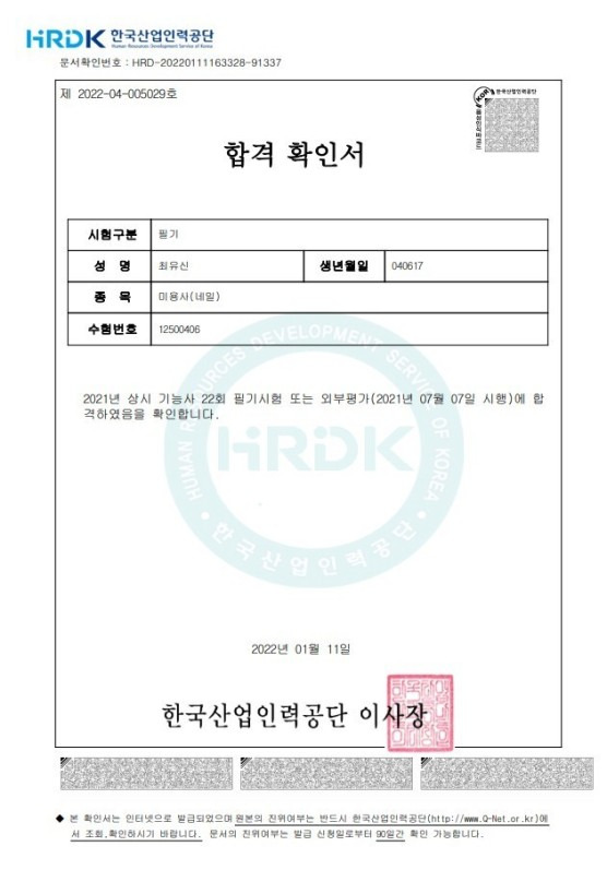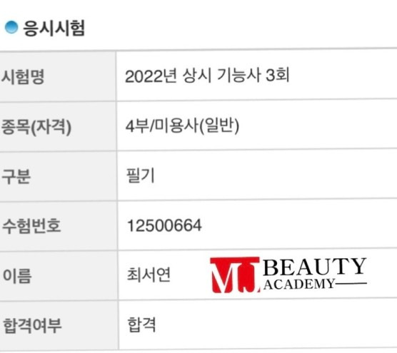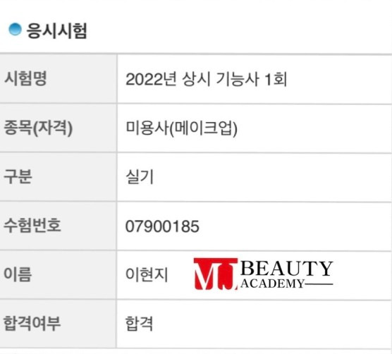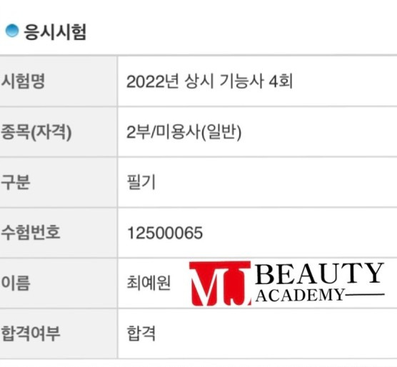 미용사(피부) 실기 김영래 합격을 축하드립니다 묵묵히 열심히 하던 모습이 아직도 기억납니다.좋은 결과 얻으신것을 축하드립니다.^^앞으로 하는 모든 일들도 다 잘되기를 바래요~~ 합격 취업 후기 2025.01.13