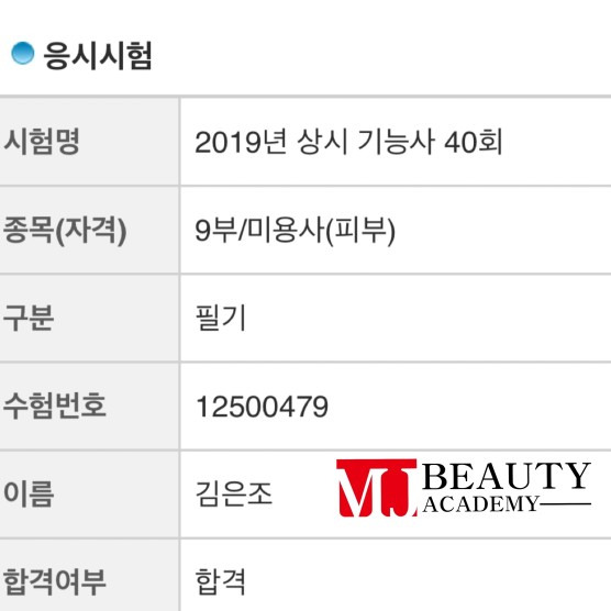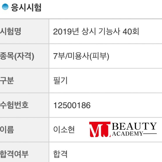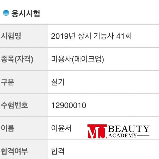 미용사(메이크업) 실기 이윤서 합격 축하드립니다 메이크업 실기 고득점 합격 성공!! 윤서양 축하합니다~^^ 올해가기전에 딱 취득하고 마무리 하네요~! 합격 취업 후기 2025.01.10